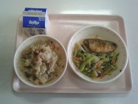 ミートスパゲティ、牛乳、花豆コロッケ、ブロッコリーとツナのサラダ、りんごゼリー