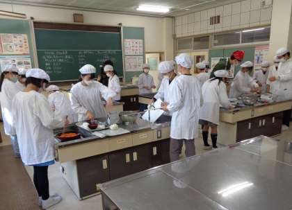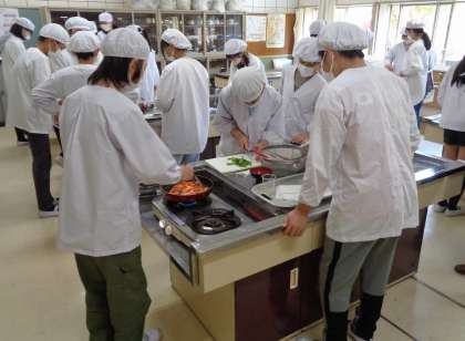 本日午前中、6年1組が家庭科の調理実習をおこないました。野菜炒めの調理ですが、グループごとに野菜の組み合わせなどを考え、それぞれのグループで分担、協力して活動していました。