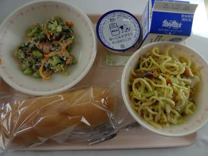 【献立】 コッペパン、牛乳、那珂湊塩焼きそば、ツナ豆マヨサラダ、ミルクプリン