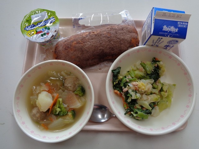 ココア揚げパン 牛乳 ツナサラダ 野菜のスープ煮 ヨーグルト