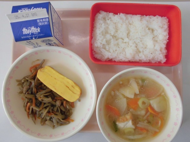 【献立】ごはん 牛乳 厚焼きたまご きんぴら 生揚げのみそ汁