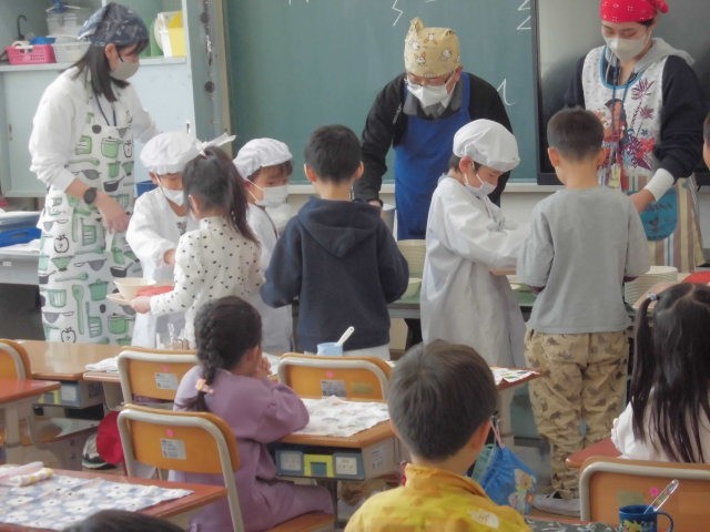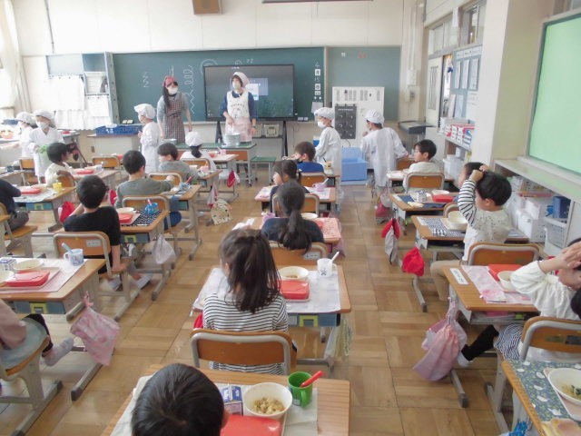 今日から1年生の給食がスタートしました。おいしい給食を目の前にしてみんな嬉しそうです。