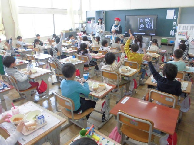 1年生が2日目の給食を食べています。先生からの「おかわりほしい人」の声にたくさんの児童が手をあげています。