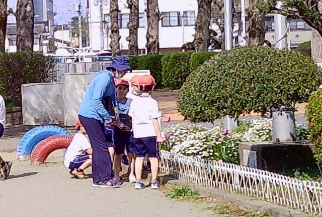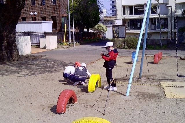 本日(4/17)1校時、3年2組が理科の観察を校庭でおこなっていました(写真)。写真撮影用のタブレットや虫めがねをもって、3年生から始まった理科の学習として、校庭の花壇などで「自然の観察」をしている様子です。
