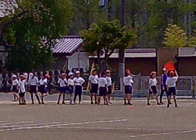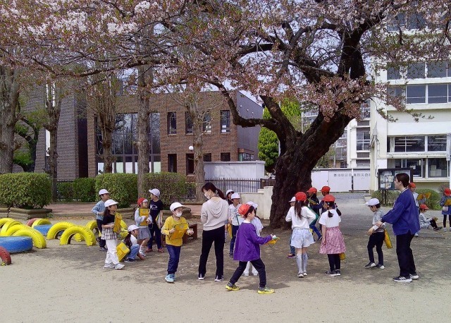 本日(4/18)4校時、校庭で学習している様子です。写真左は2年1組の生活科の学習で、「春見つけ」をしている様子です。写真右は6年3組の体育の学習で、順番に50m走をおこなっているところです。