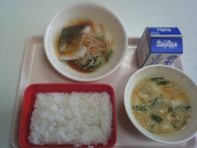 ごはん 牛乳 さばのみそだれかけ ささみと大根の梅ドレッシングサラダ かきたま汁