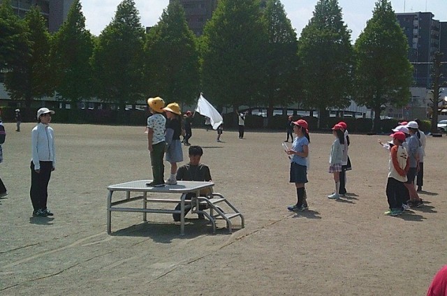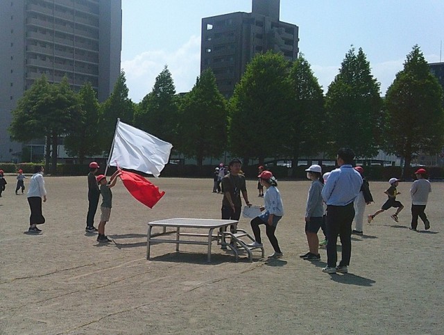 本日(5/1)昼休み、運動会開会式・閉会式の係になっている児童が、校庭で練習をおこなっていました。「朝礼台」への登り方、礼の仕方など、当日に向けての練習です。堂々と表現できることを願っています。