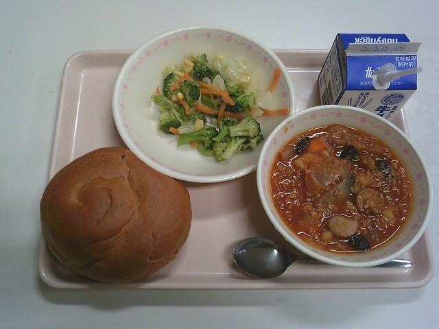 黒パン 牛乳 チリビーンズ ブロッコリーとコーンのサラダ