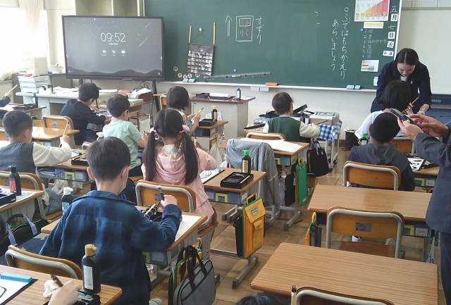 本日(5/7)1・2校時、3年生の各授業にゲストティーチャーをお招きして、習字の学習をおこないました。習字道具の名称や使い方をお聞きして、筆でいくつもの丸を書いている様子です(写真)。