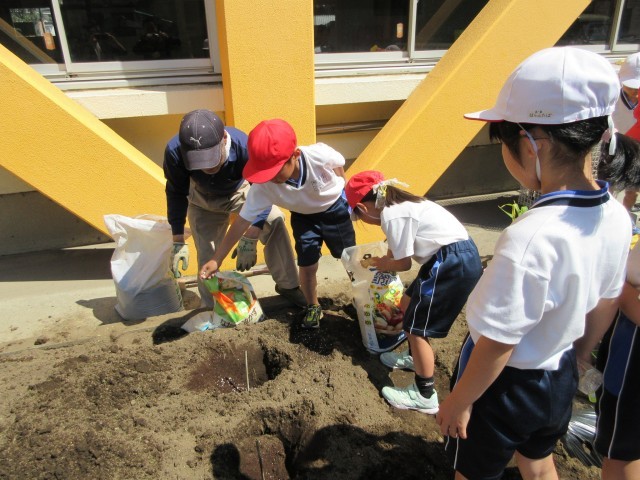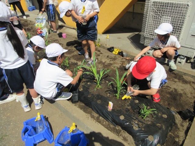 2年生がゲストティーチャーの先生に手伝ってもらって苗を植えました。花壇にはトウモロコシ、カボチャ、枝豆の苗を植えました。