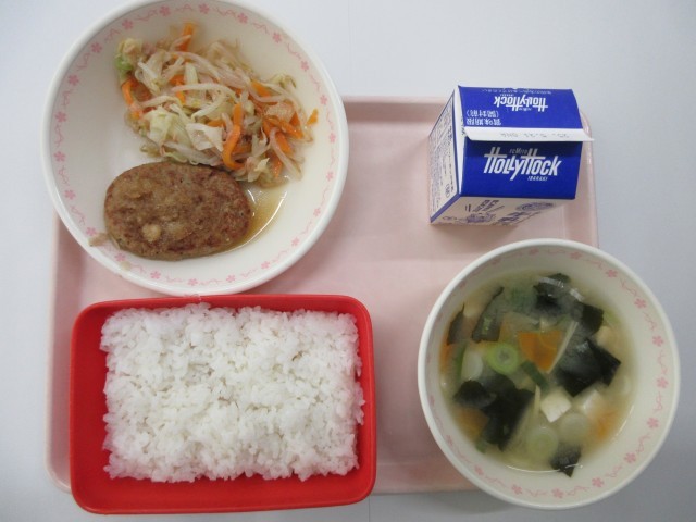 【献立】ごはん 牛乳 おろしハンバーグ ツナともやしのあえ物 若竹汁