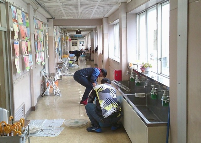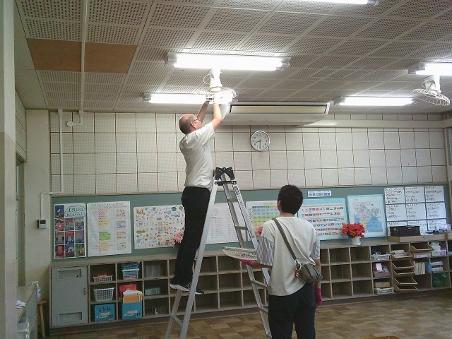 5/10(土)午前中、おやじの会活動会員の方に、教室の天井扇風機の掃除をおこなっていただきました。毎年、使用前のこの時期、ガードとファンを外して(写真左)、洗浄して(右)、元に戻して、落下防止の結束バンドで付けるまでのボランティア活動です。お世話になりました。ありがとうございます。