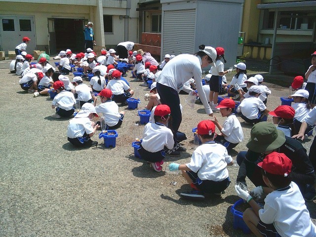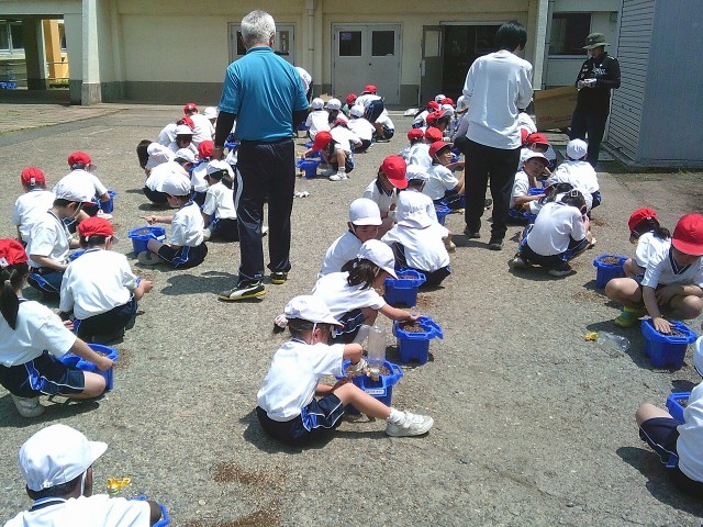 本日(5/13)3校時、1年生が昇降口前広場で、アサガオの種植えをおこないました。生活科の学習として、元肥を入れ、そして種をまきました。昇降口前に置いたプランターへの水やりを一人一人がおこない、観察をしていきます。
