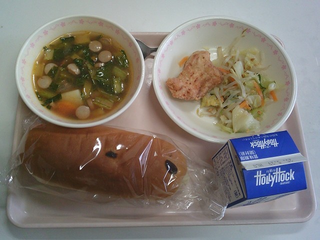 レーズンパン 牛乳 米粉のフライドチキン カリカリ大豆サラダ ミネストローネ