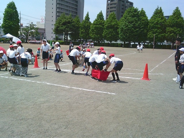 本日(5/21)午前中、運動会予行をおこないました。写真は6年団体種目の様子です。各種目の準備、出発、審判などの係活動について、実際に競技や演技をしながら確認していきました。反省と最終準備をおこなって、24日当日を迎えます。