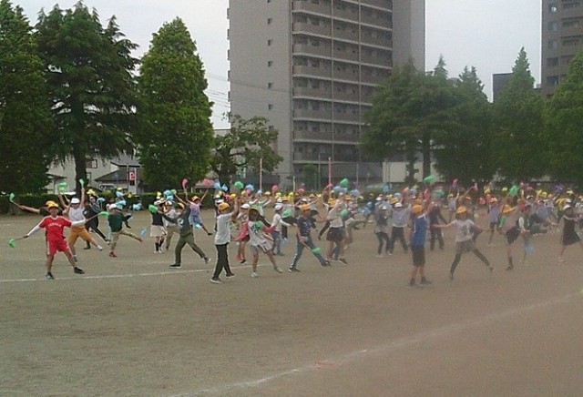 本日(5/23)、運動会前日です。写真左は1校時の1・2年生の練習風景、右は3校時の3・4年生の練習の様子です。体操服は当日着用するため、昨日からは私服でおこなっています。