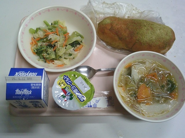 抹茶きなこ揚げパン 牛乳 レモンドレッシングサラダ ワンタンスープ ヨーグルト