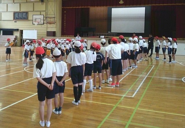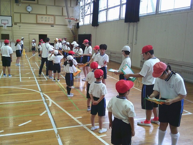 本日(6/3)2校時、体育館での授業の様子です。写真は、1年生のシャトルラン回数の記録を6年生がお手伝いをするところです。相互記録ができない学年・種目については、上級学年がこのようにお手伝いに入ります。