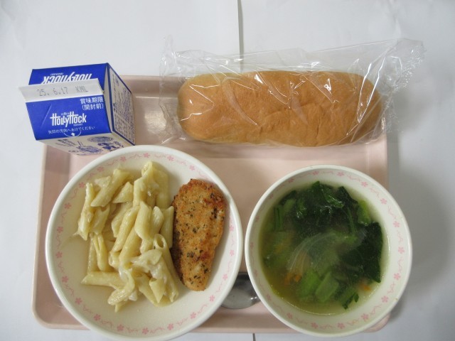 【献立】コッペパン ブルーベリージャム 牛乳 白身魚のバジルフライ ペンネソテー レタスのスープ