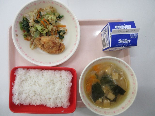 【献立】ごはん 牛乳 鶏肉の梅風味揚げ おかかあえ 厚揚げのみそ汁