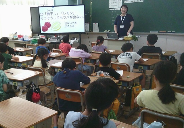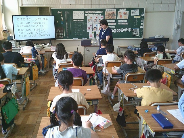 本日(6/12)、3年生が「よくかんで食べる」をテーマに、食について学習しました。市教委事業の栄養教諭による食育訪問を活用して、今年度も大島中学校の栄養教諭に来ていただいています。写真左は2校時の2組、右は3校時の1組の様子です。
