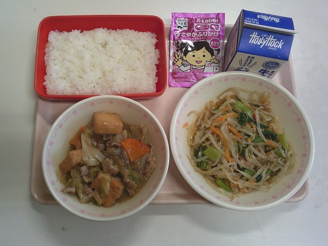 ごはん おかかふりかけ 牛乳 豚肉と厚揚げのみそ炒め わさびあえ