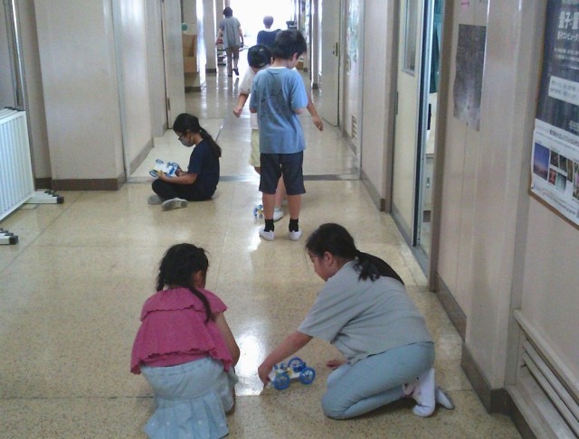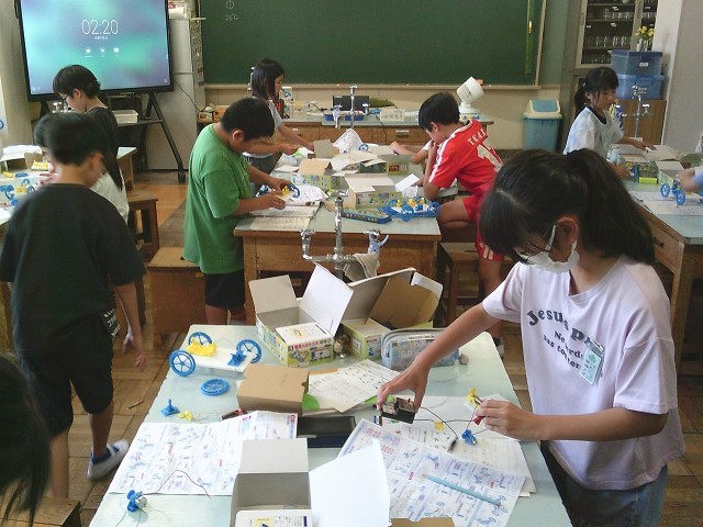 本日(6/17)5校時、4年1組の理科学習の様子です。「電池のはたらき」で、乾電池で回路をつくり、モーターでタイヤを回したり、豆電球を点灯したりしていました。写真左は、回るタイヤを廊下で走らせている様子です。