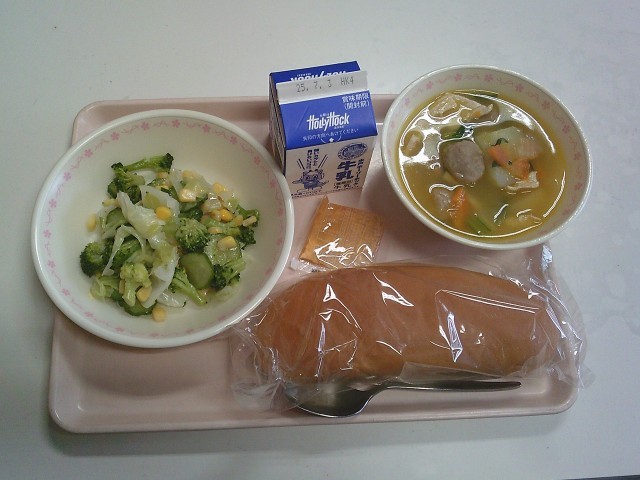 牛乳 コッペパン りんごジャム 野菜と肉団子のスープ煮 ブロッコリーサラダ