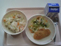 【献立】コーンピラフ 牛乳 白身魚のフライ チーズ入り小松菜サラダ ...