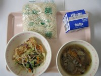 【献立】ソフトめん 牛乳 五目汁(うどん用) ちくわの天ぷら からしあえ