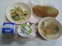 【献立】抹茶きなこ揚げパン 牛乳 レモンドレッシングサラダ ワンタンスープ ヨー...