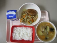 【献立】ごはん 牛乳 和風ハンバーグ 野菜とささみのしょうがあえ じゃがいものみ...