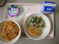 【献立】スパゲッティアラビアータ 牛乳 コロッケ 小松菜サラダ ぶどうゼリー