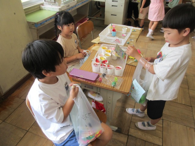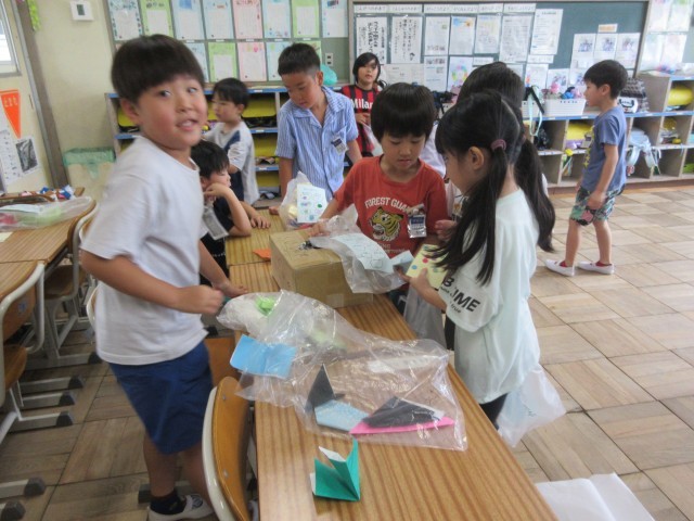 1年生の教室では、お楽しみ会をしていました。グループごとに、手作りのわなげやペットボトルボーリング、くじびき、かきごおり屋さんがあり、「いらっしゃいませ」と、大盛況でした。上手にボーリングができると、「がんばったね。すごい。」と、温かい声かけをかけていました。メッセージカードや折り紙で作ったプレゼントももらい、みんな笑顔いっぱいでした。