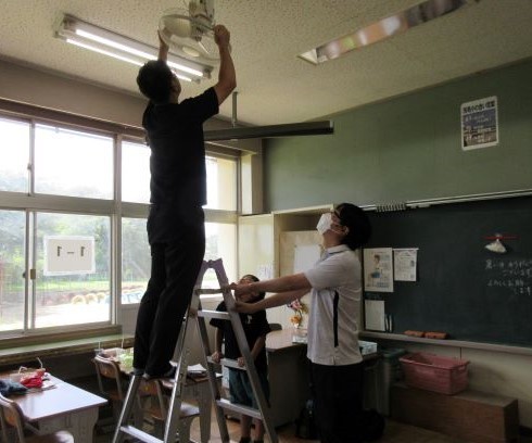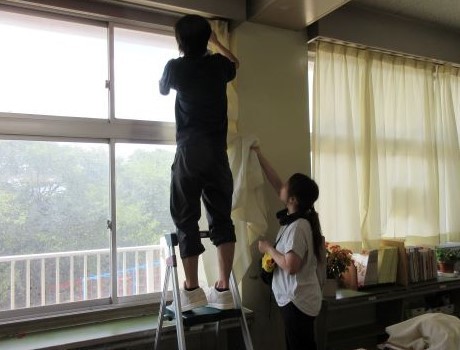 7月19日(土)第2回PTAクリーン大作戦が行われました。扇風機掃除とカーテンの洗濯に、たくさんの保護者の皆様や児童が参加してくれました。はずした扇風機の羽根を洗ったり、カーテンのフックを付けたり、子供達も出来る仕事を進んで手伝いました。高所の作業が多かったですが、脚立等を使って、ケガなく作業を進めることが出来ました。お休みのところ、たくさんの皆様にご協力をいただきありがとうございました。
