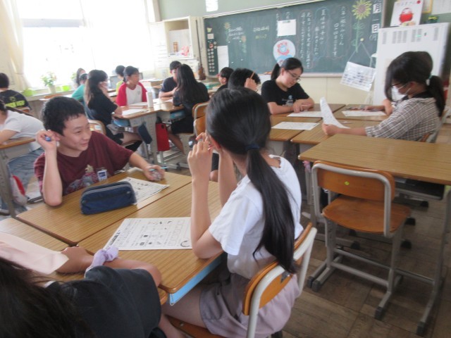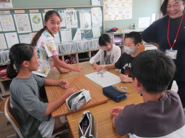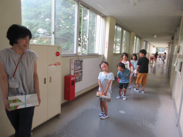 新しい教科書が配られました。代表の児童が先生と一緒に教室に運んでいます。グループになって夏休みの思い出をゲーム形式で楽しく友達と伝え合っています。素敵な笑顔が見られますね。