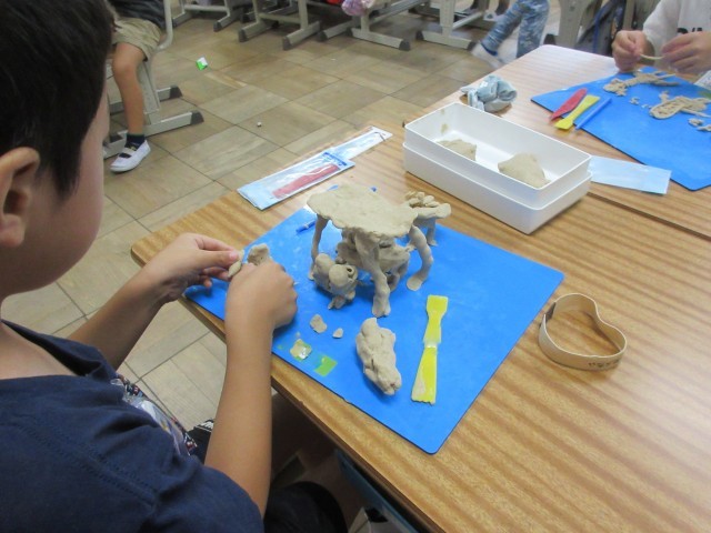 1年生は、図画工作の時間に夏休みの思い出を、粘土で表現しました。「お庭でバーベキューをしたよ。」「パパとママで花火をしたよ。」「かき氷を食べたよ。」「プールで遊んだよ。」と、楽しい思い出を嬉しそうに教えてくれながら、夢中になって取り組んでいました。