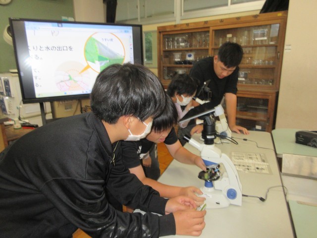 6年生の理科の「植物の体のつくりとはたらき」では、「水は葉のどこから水蒸気としてでていくのか」の学習でした。ホウセンカの葉を顕微鏡で調べ、気孔の役割を考えました。