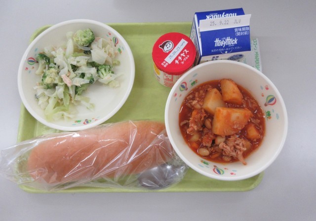献立 はちみつパン 牛乳 ポークビーンズ グリーンサラダ ヨーグルト