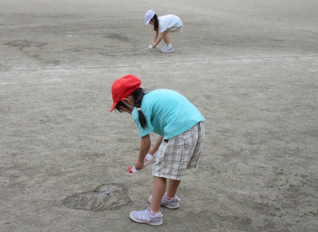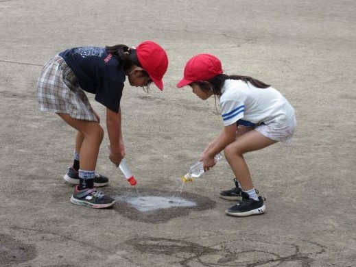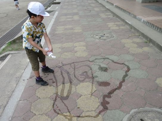 9月12日(月)1年生が生活科の「なつとなかよし」の学習で、水遊びをしました。マヨネーズや洗剤の空き容器で、みんなで仲良く絵を描いたり、水鉄砲のように遠くに飛ばしたりして楽しみました。とても楽しそうでした。