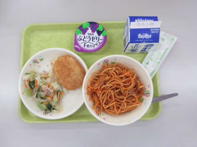 献立 スパゲッティアラビアータ 牛乳 コロッケ 小松菜サラダ ぶどうゼリー