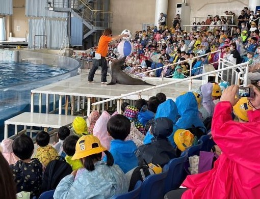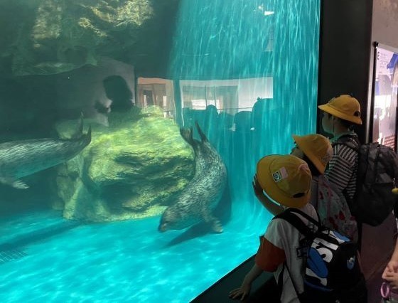 無事にアクアワールドに着きました。大きな水槽の前では、熱心に魚を観察する姿が見られました。楽しみにしていたイルカのショーでは、水しぶきを浴びて、大喜びです。みんな元気に水族館を楽しんでいます。