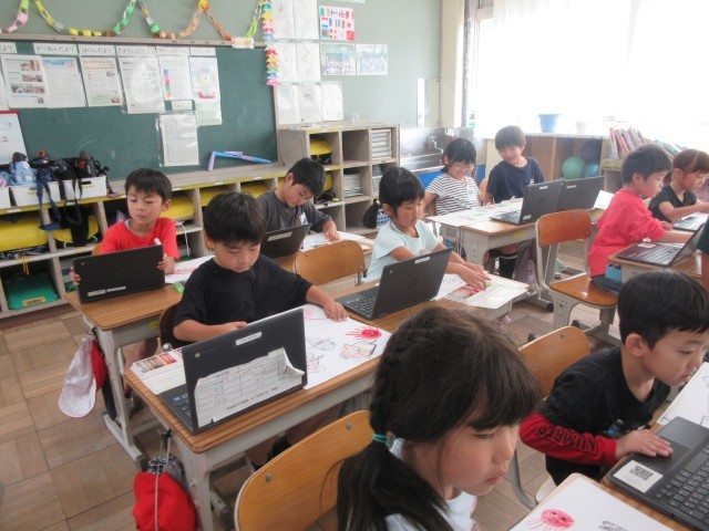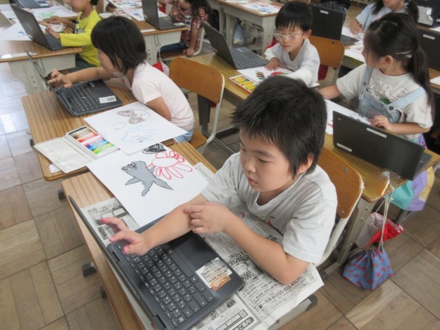 1年生は、先日の遠足「アクアワールド大洗」で見つけた魚を絵に描きました。 楽しかった遠足を思い出しながら、サメやイルカ、くらげなど、見つけた魚を夢中で描いていました。