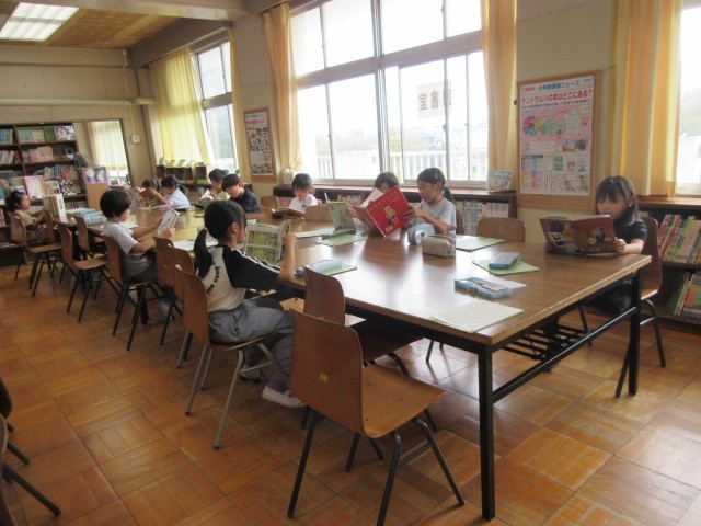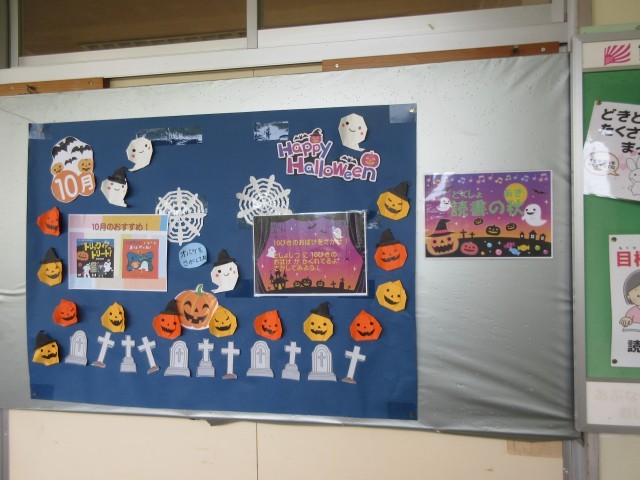 図書室前の掲示物は、10月バージョンに張り替えられました。毎月、図書ボランティアの方によって、季節に合った図書室の環境整備をしていただいています。子供たちのために、ありがとうございます。今日の4校時は、2年生が図書室で読書をしました。読書の秋。素敵な本と出会えるといいですね。