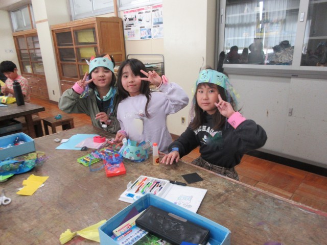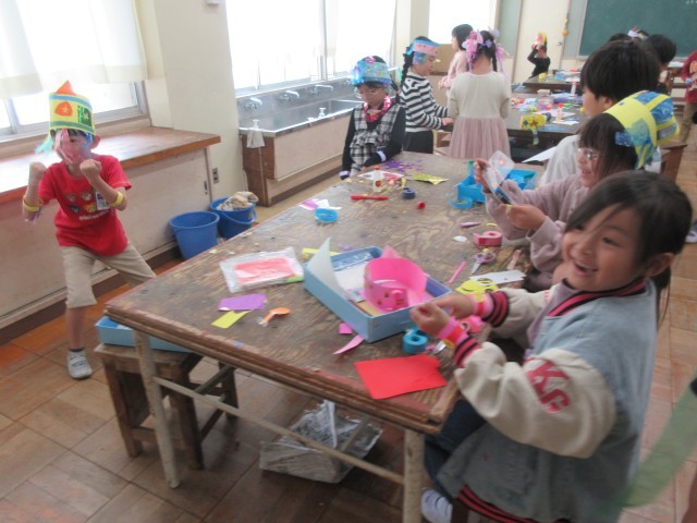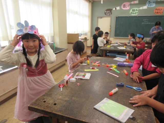 わっかを作って、何に変身しようかな。腕輪やかんむりに、工夫しながら飾り付けをしました。