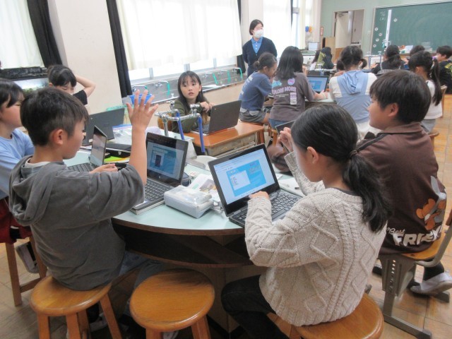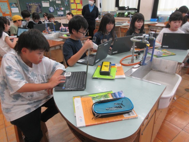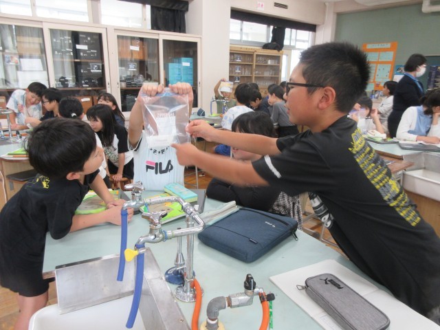 4年生の理科では、水蒸気が空気中に含まれているか調べる学習でした。6グループに分かれ、階段や廊下、昇降口などの場所で、保冷剤を使って調べました。調べた結果から、更に疑問に思ったことやどうしてそうなったのかを考察しました。