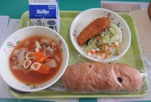 〈本日の献立〉 牛乳 レーズンパン しろみざかなフライ チーズ入りこまつなサラダ ミネストローネ