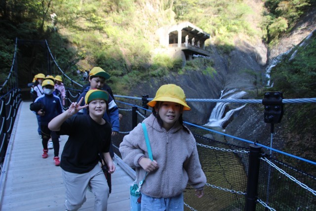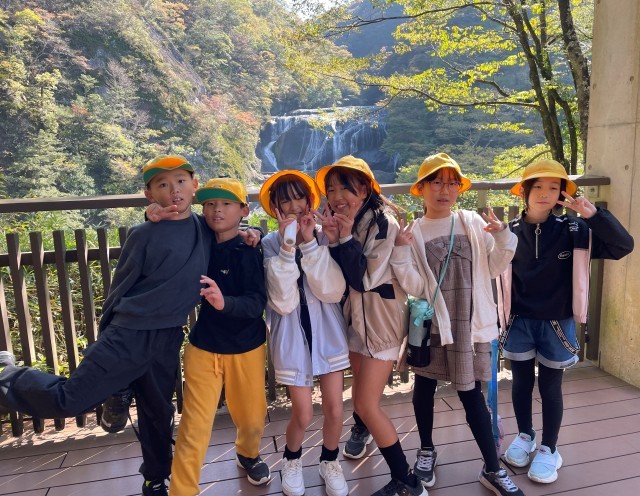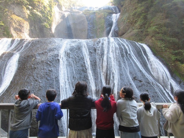 4年生は、大子方面へ遠足に行きました。バスの中では、グループごとに計画していたレクリエーションで盛り上がり、元気いっぱいでした。袋田の滝に着き、滝を目の前にすると、「うわあ!」という声が上がりました。子どもたちは迫力ある滝に釘付けでした。
