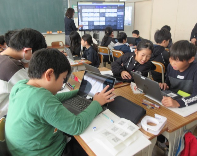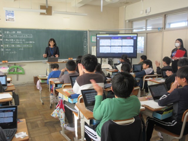5年生の算数では、分数と小数の計算の仕方を考える学習です。5年生の算数は、ティームティーチングで指導をしています。自力解決したあと、グループで考えを伝え合いました。いくつかの考えがだされ、どの考えが一番分かりやすかったをグループで話し合うことができました。タブレットを活用して、自分の考えを説明したり、友達の考えを共有したりしながら、学び合う姿が見られました。