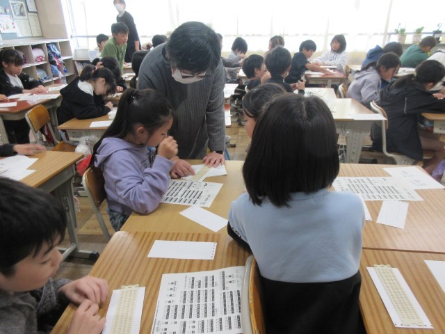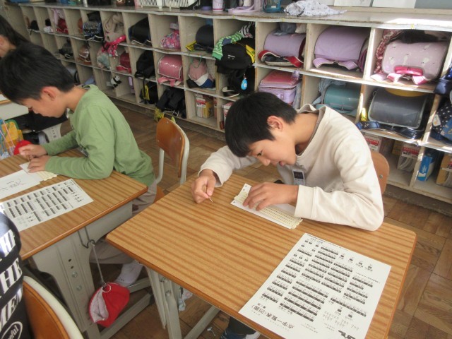 4年生は、4名の点字体験学習講師をお招きして、点字体験をしました。講師のの方から、点字のしくみや点字の打ち方を教えていたあきました。これまで4年生は福祉の学習として、車椅子体験やアイマスク体験、手話体験をしてきました。子供たちは、点字体験を通して、目の不自由な方の困っていることやコミュニケーションの手段を知り、自分たちができることを考えることができました。